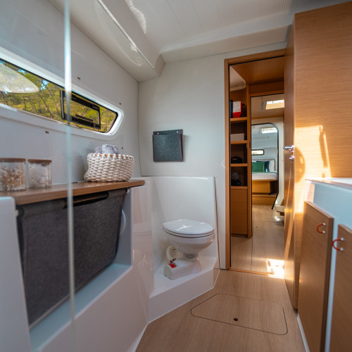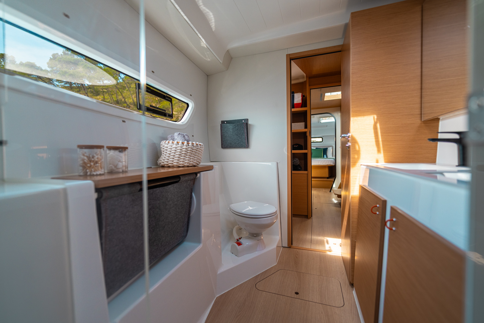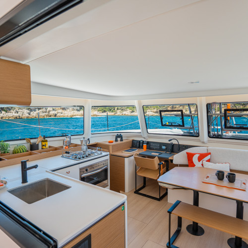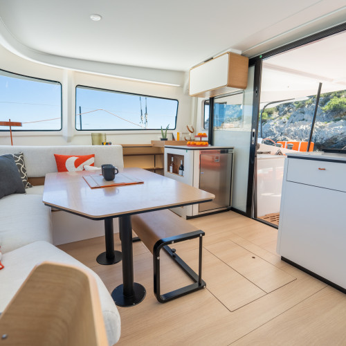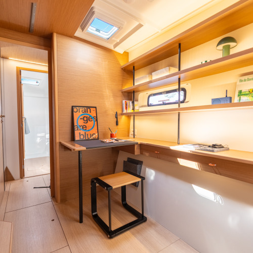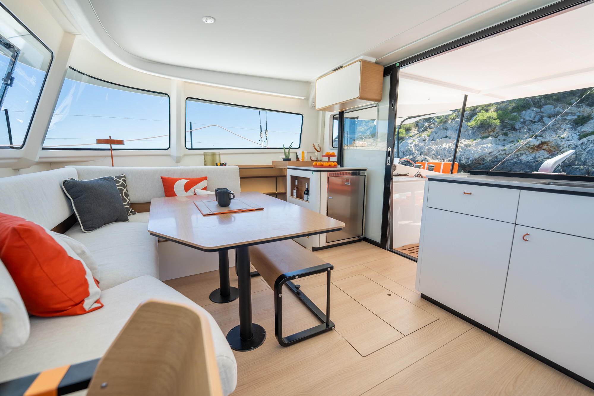 Carré, ouverture et légèreté : Un intérieur lumineux et épuré, où chaque volume est optimisé pour prolonger l’expérience de navigation.