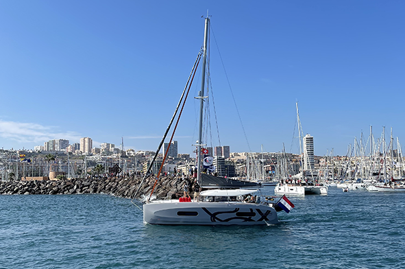Si tratta dell'Excess 11 Bombarda. A bordo ci sono gli armatori Marco e Lizzy e due reclute per assisterli nella traversata atlantica.